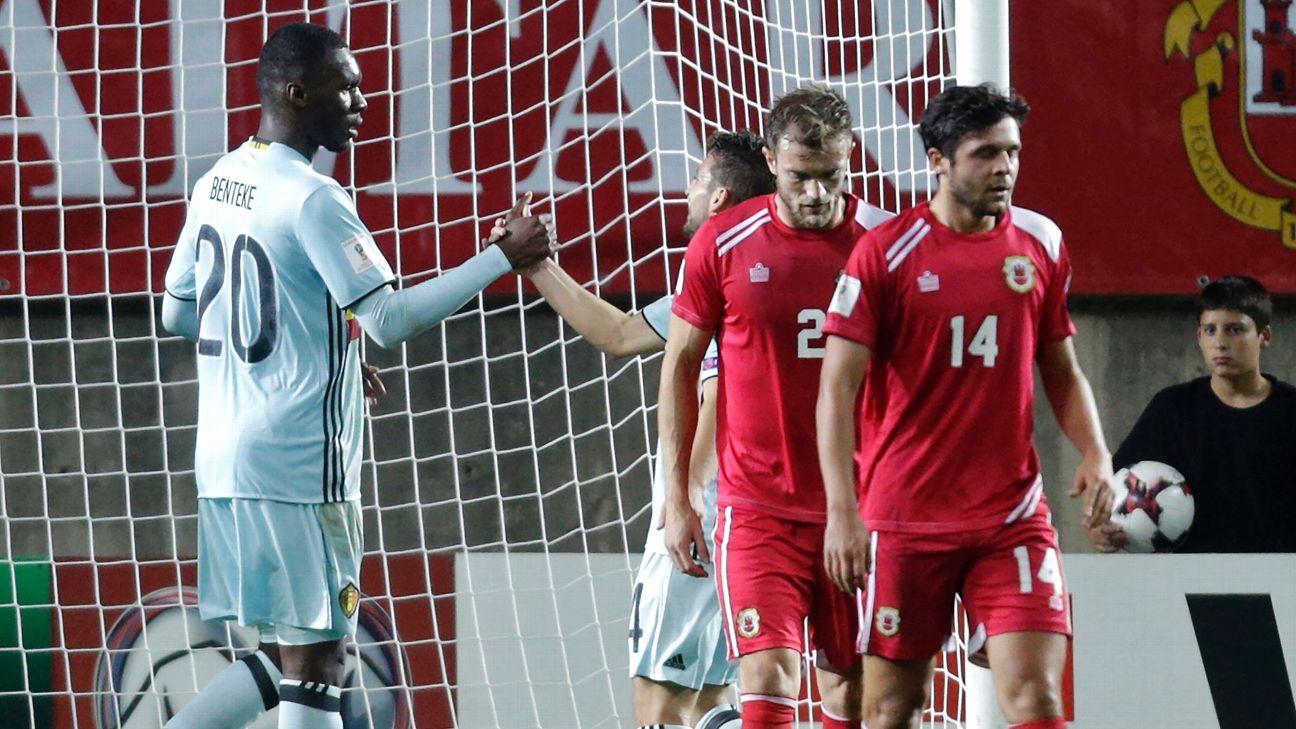 The hosts, playing in Portugal because their stadium does not meet FIFA standards, played the ball backwards from the kickoff to Jamie Bosio, who then tried to pass across to a teammate. But Benteke intercepted the pass and ran into the box before putting a shot past goalkeeper Deren Ibrahim.